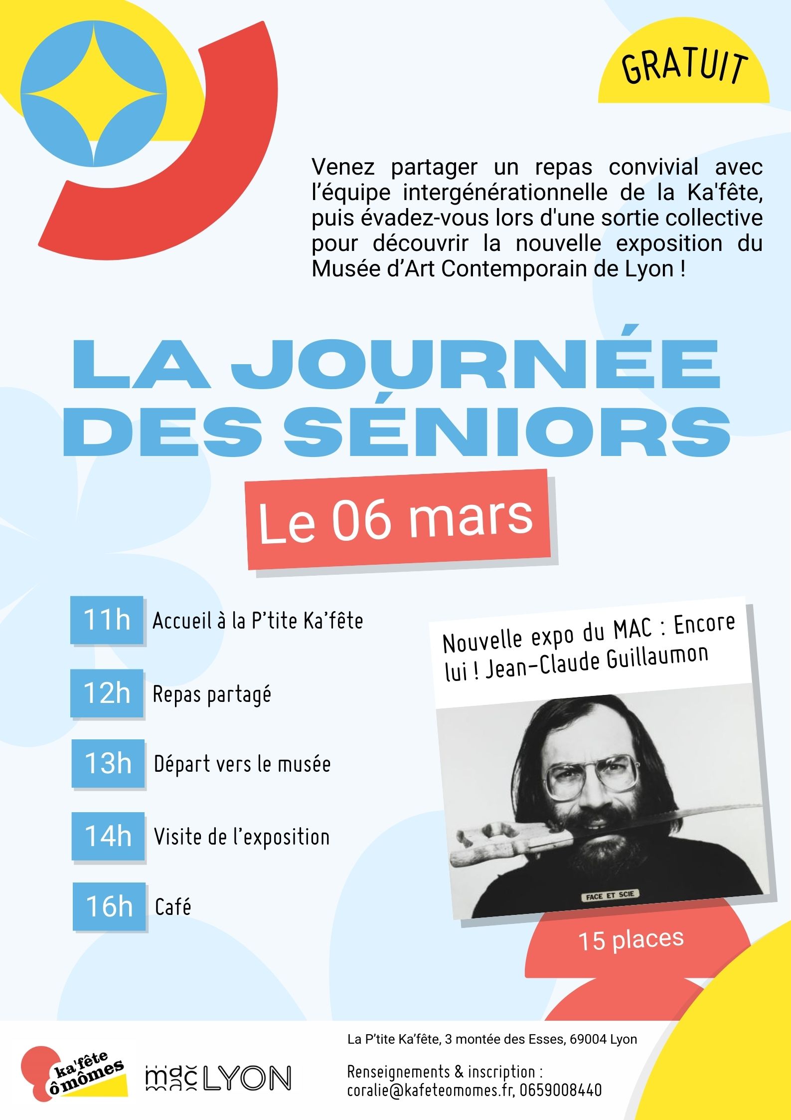 Ensuite, évadez-vous lors d’une sortie collective pour découvrir la nouvelle exposition du Musée d’Art Contemporain de Lyon : « Encore Lui ! Jean-Claude Guillaumon ». Visite guidée. En fin de journée on partagera un petit café pour se dire au revoir.
